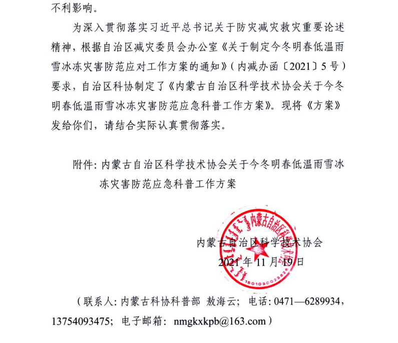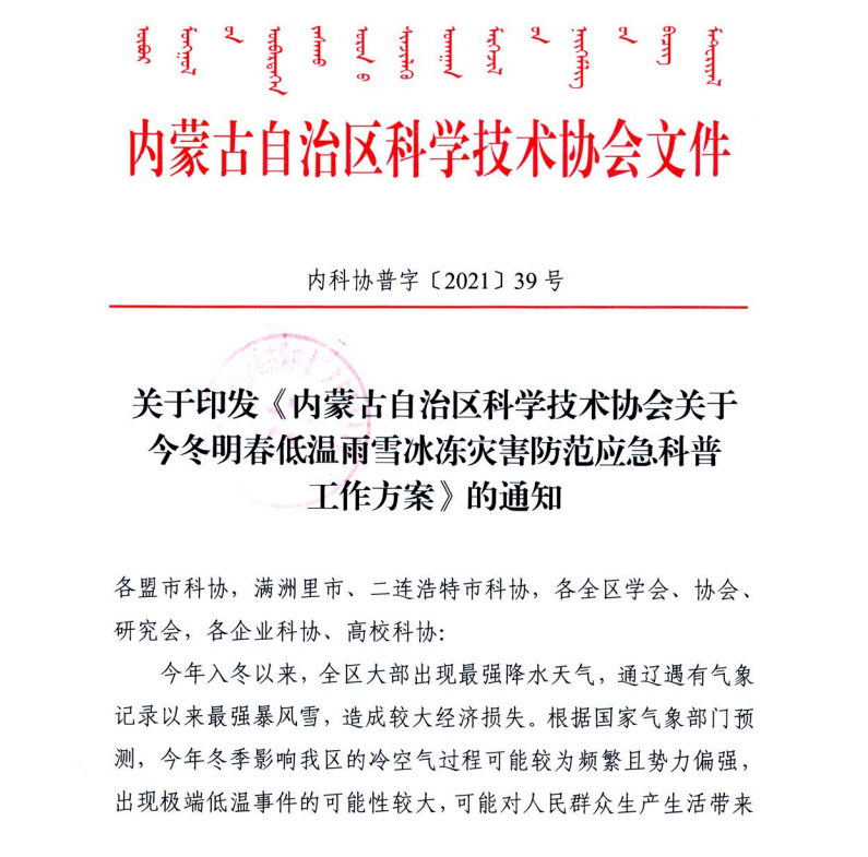 自治区科学技术协会成立今冬明春低温雨雪冰冻灾害防范应急科普工作领导小组,统筹领导全区雨雪冰冻灾害防范应急科普工作,科普部具体负责相关工作沟通协调、组织动员、宣传传播等具体工作。各盟市科协也要成立相应的工作领导小组及办公室,统筹做好本区域内雨雪冰冻灾害防范应急科普工作,并将工作情况及时报告自治区科协。