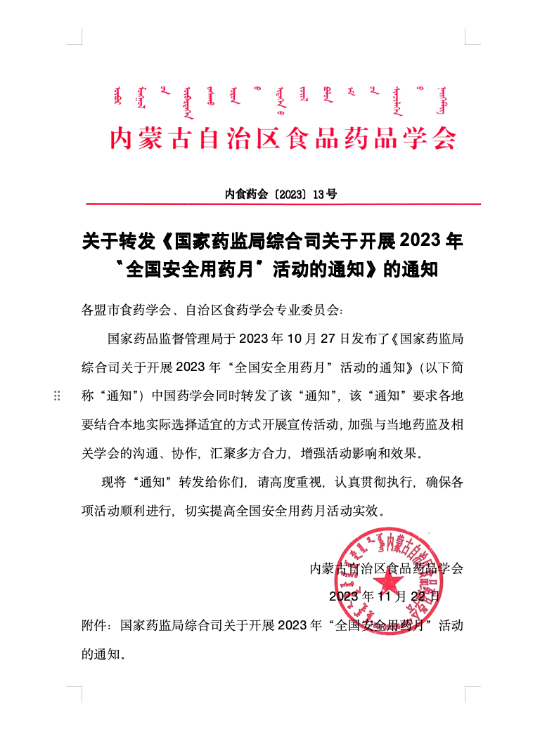 附件:国家药监局综合司关于开展2023年“全国安全用药月”活动的通知。